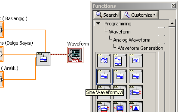 Ön panelde olması gereken tüm kontrol ve göstergeler yerleştirdikten sonra blok diyagramda bu nesnelere ait kaynak kod düzenlenir. Block diyagram üst menüsünden View / Functions paleti açınız. Açılan functions paletinde Programming / Waveform / Analog Waveform / Waveform Generation eklenerek gerekli bağlantılar yapılır.