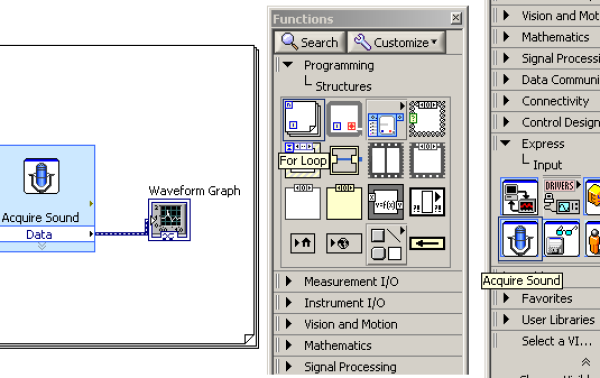Ön panele kontrol panelinden ses dalgalarını görüntülemek amaçlı Modern / Graph / Waveform graph ekleyelim. Ön panelde olması gereken tüm kontrol ve göstergeler yerleştirdikten sonra blok diyagramda bu nesnelere ait kaynak kod düzenlenir. Block diyagram üst menüsünden View / Functions paleti açınız. Açılan functions paletinde Programming / Structures / For loop eklenir genişletilir ve numarandır ılır. Genişletilen for loop içine waveform graph ve Express / İnput / Acquire sound eklenerek gerekli bağlantılar yapılır.